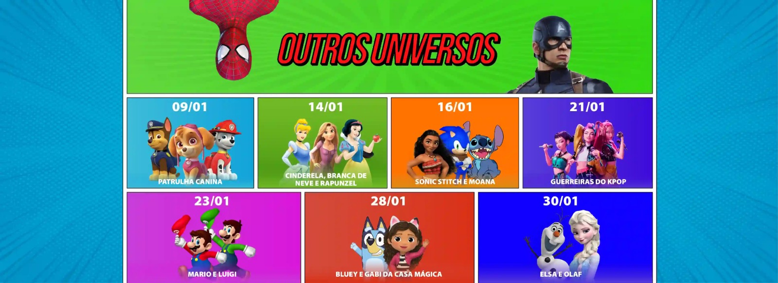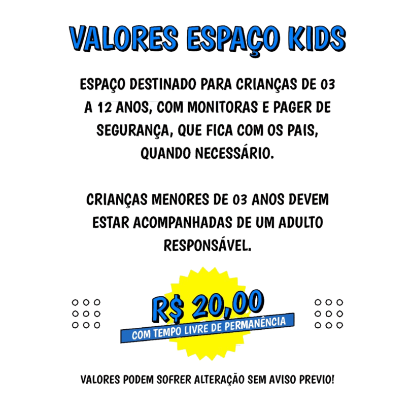 Espaço ideal para crianças de 3 a 12 anos, crianças com menos de 3 anos obrigatório a presença de um responsável com mais de 18 anos.
